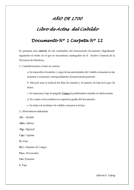 Se presenta una síntesis de los contenidos del mencionado documento digitalizado siguiendo el orden en el que se encuentran catalogados en el Archivo General de la Provincia de Mendoza.